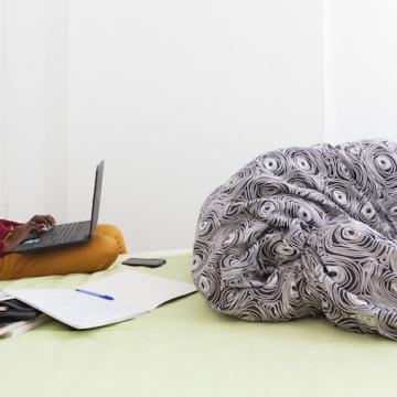 Six semaines de pleine plongée dans le processus d’écriture : je retrouve chez lui l’émotion ténue qu’insuffle ce hors-temps spécifique, que j’ai moi-même expérimenté quelques mois auparavant. Il me raconte, avec son élan contagieux, son appétence à s’extraire ici du rythme très cadencé de ses semaines à Cotonou, où son métier de greffier au tribunal occupe la plus grande partie de ses journées. Il marche souvent tôt le matin dans les rues de Bordeaux, puis s’installe derrière son ordinateur pour avancer sur son texte.