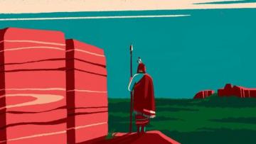 Un Indien solitaire contemple un paysage emblématique de l’Ouest américain, ciel bleu intense, terre rouge, rocs imposants, immémoriaux, vibrants de la lumière chaude d’une journée finissante.